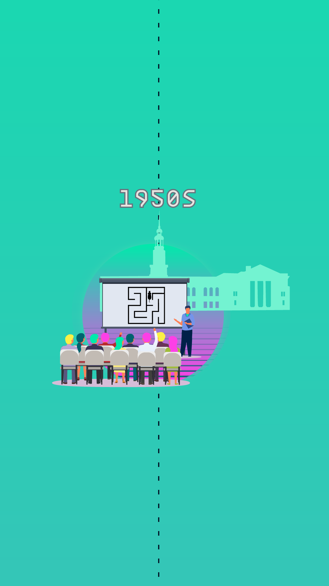 The machine is a five-tonne computer the size of a room which is fed a series of punch cards. After 50 trials, the computer teaches itself to distinguish cards marked on the left from cards marked on the right.